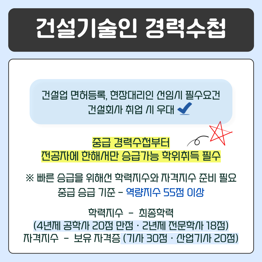 중급 건설 기술인 경력 수첩 승급을 위한 조건