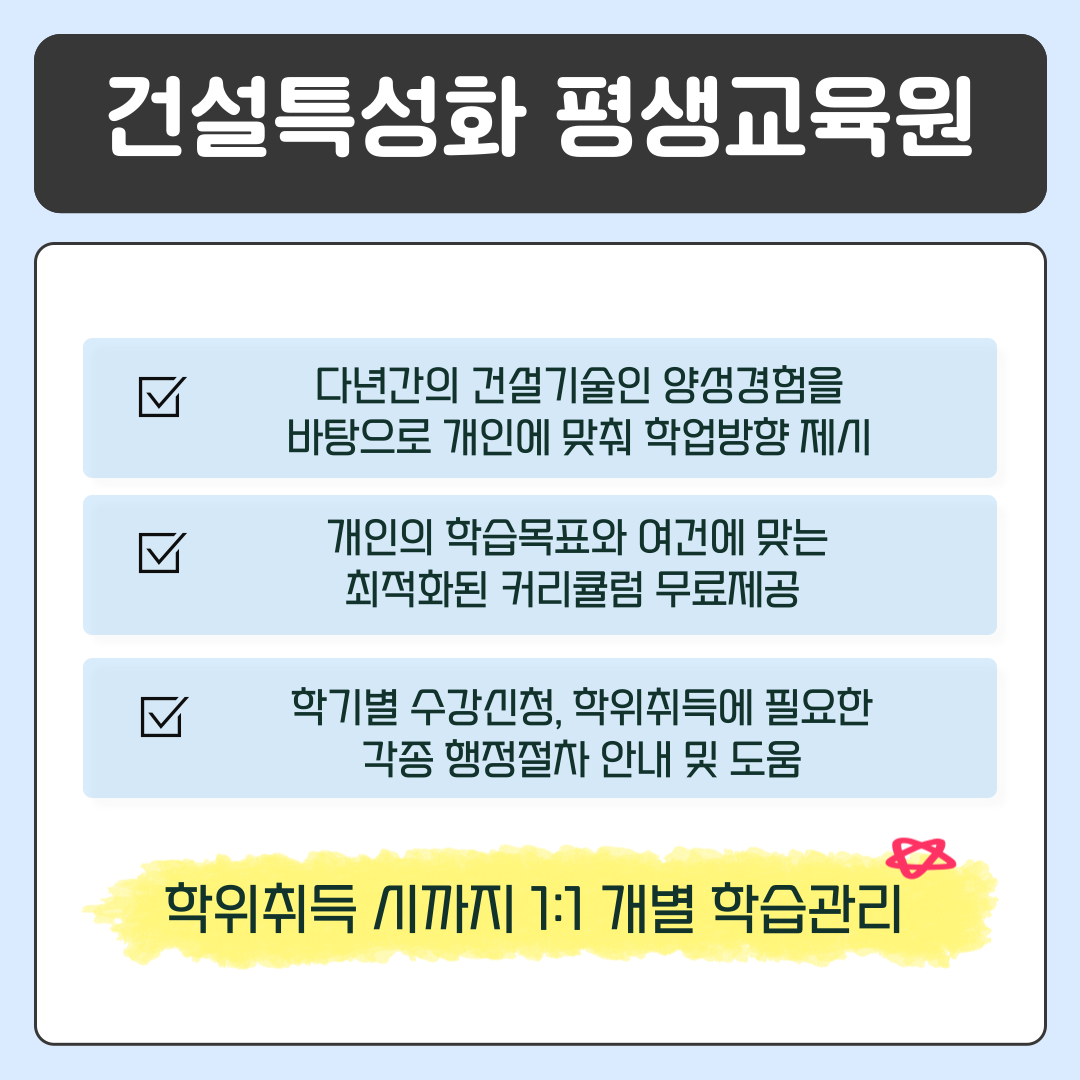 건설 특성화 평생교육원인 한양건축평생교육원은 다년간의 건설 기술인 양성 경험을 바탕으로, 개인의 목표와 여건에 맞춘 최적화된 커리큘럼을 제공합니다. 교육원은 학기별 수강신청, 행정절차 지원, 취업지원 등 다양한 서비스를 제공하여, 건축기사 자격증 취득과 건축공학 학사 학위 취득을 원활하게 도와줍니다.