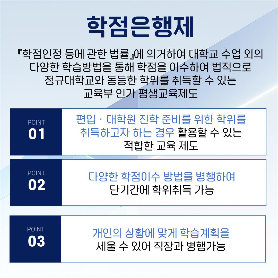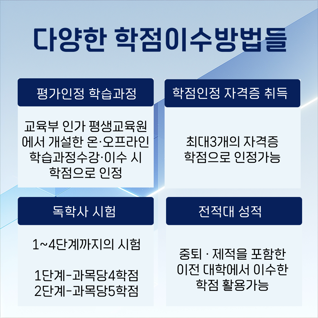 ● 독학사 시험 또는 전적대 성적을 활용하여 학점을 인정받을 수 있습니다.