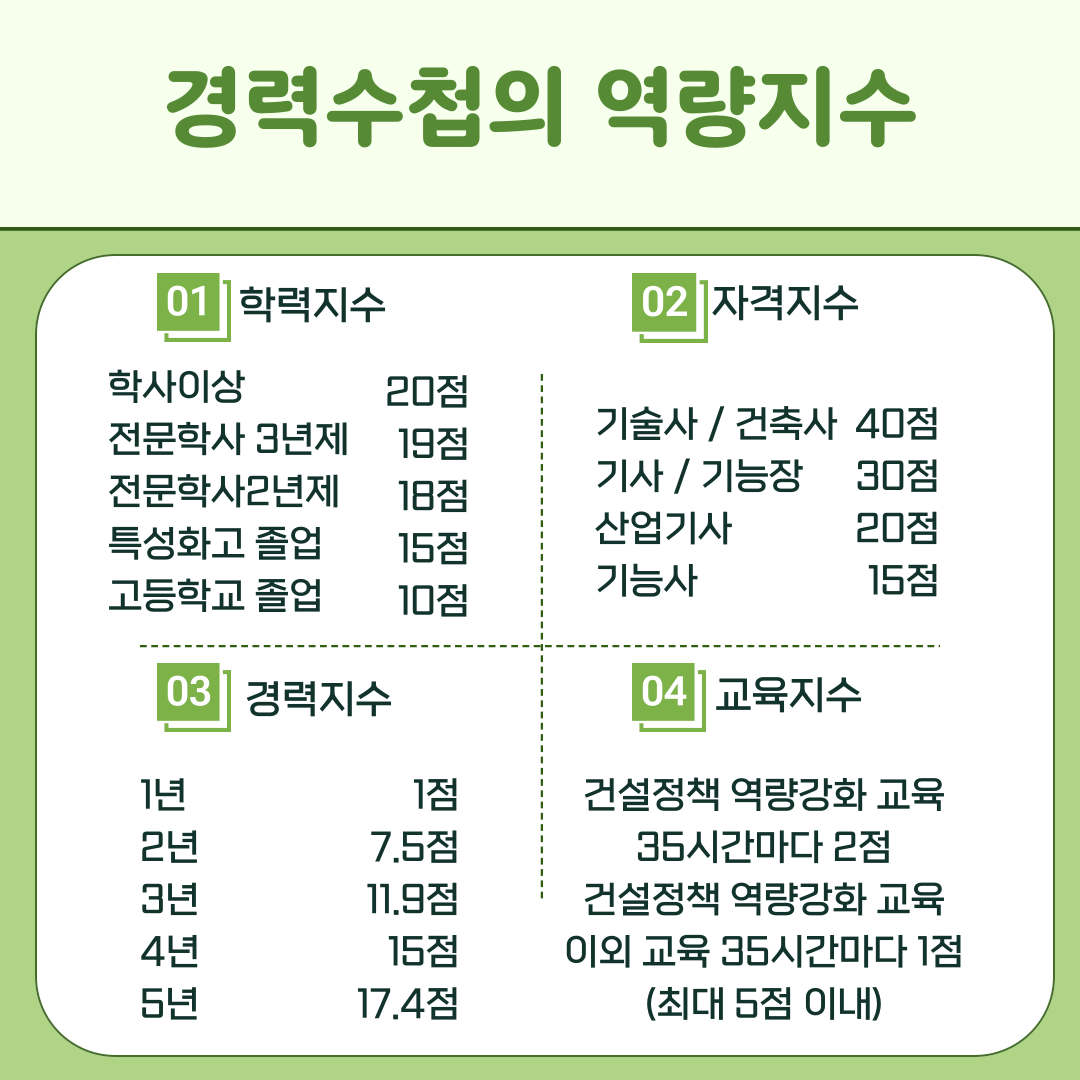 경력 수첩의 역량지수는 학력지수, 자격지수, 경력지수, 교육지수로 산정됩니다. 이 네 가지 항목의 합산 결과가 일정 기준을 초과하면 중급기술자로 승급될 수 있습니다. 또한, 학점은행제를 통한 승급 방법으로는 전공 학위 취득이나 기사 자격증 취득으로 교육지수를 합산하면 승급이 가능합니다.