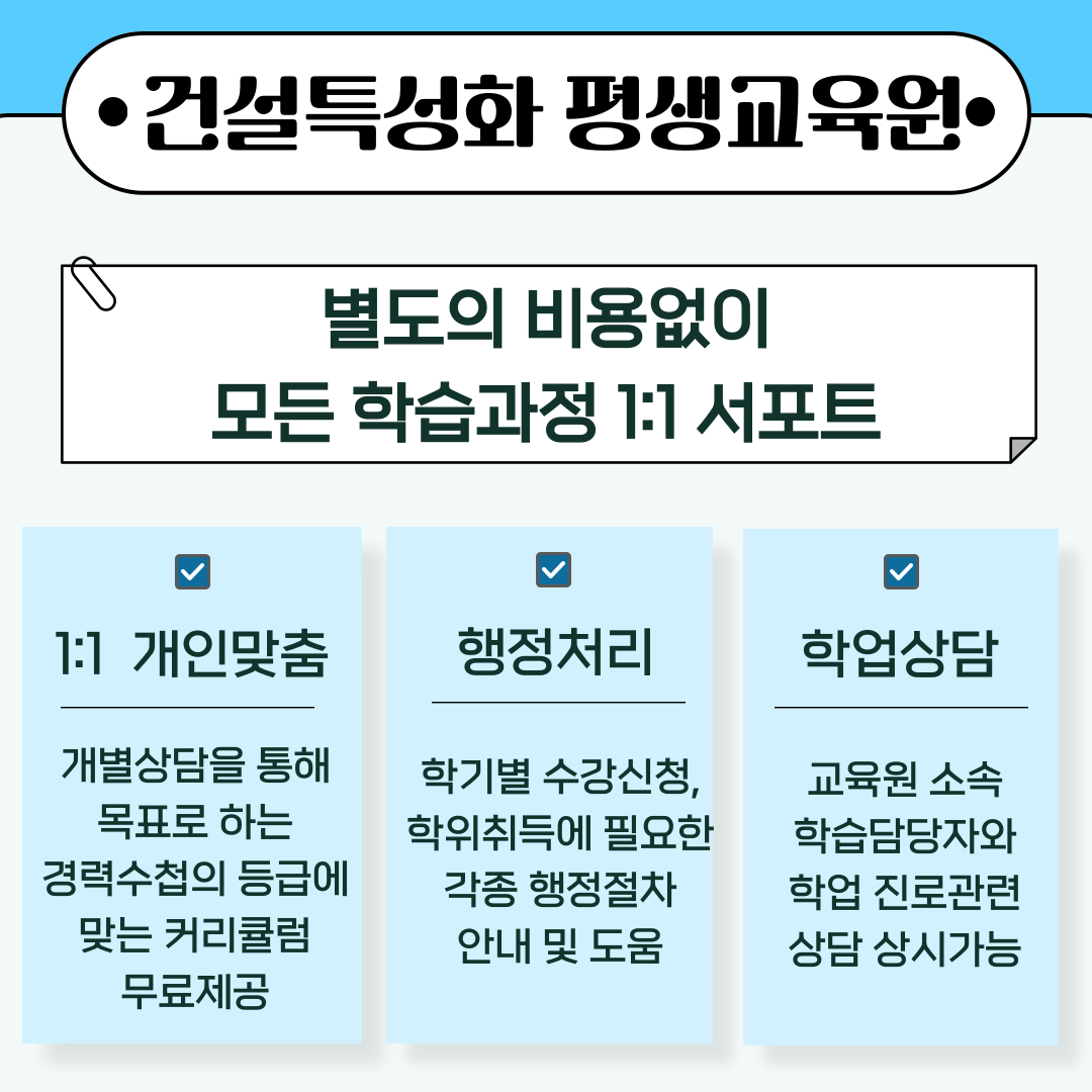 한양건축평생교육원은 건설 특성화 교육 프로그램을 제공하며, 1:1 개인 맞춤형 지원을 통해 효율적인 학습을 지원합니다. 교육과정은 행정 처리와 학업 상담 등 다년간의 노하우를 바탕으로 한 맞춤형 컨설팅을 받을 수 있어, 수험생들에게 큰 도움이 됩니다.