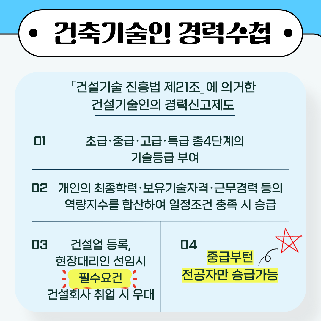 건설 기술인 경력 수첩은 「건설기술진흥법 제21조」에 의거하여 건설 기술인의 경력 신고 제도에 따라, 초급, 중급, 고급, 특급의 4단계 기술 등급을 부여합니다. 이 경력 수첩은 개인의 학력, 보유 자격증, 근무 경력 등을 종합적으로 평가하여 승급 여부가 결정됩니다.