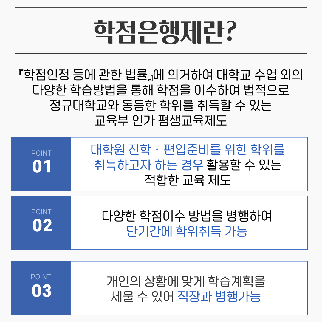 교육부에서 시행하는 학점은행제는 다양한 학점 이수 방법을 통해 단기간 내 건축학사 학위를 취득할 수 있는 기회를 제공합니다. 학점은행제를 통해 빠르게 건축학사 학위를 취득하고, KAAB 인증 건축 전문대학원에 진학하여 필요한 학기 수를 이수한 뒤 실무수련을 마친 후 건축사 시험에 응시할 수 있습니다.