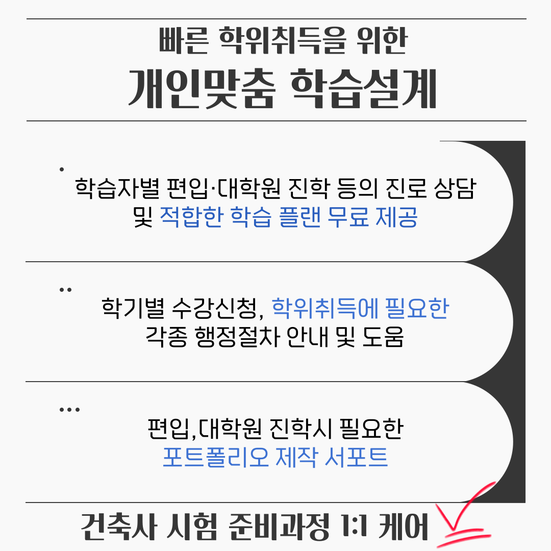 건축사 시험을 준비하는 과정에서 중요한 점은 효율적인 학위 취득과 준비 과정입니다. 이를 위해 한양건축평생교육원의 맞춤형 1:1 컨설팅 프로그램을 활용하면, 각 학습자의 상황에 맞는 전략을 제시받을 수 있습니다. 이를 통해 더 쉽고 편리하게 건축학사 학위를 취득하고, KAAB 인증 건축 전문대학원에 진학할 수 있습니다.