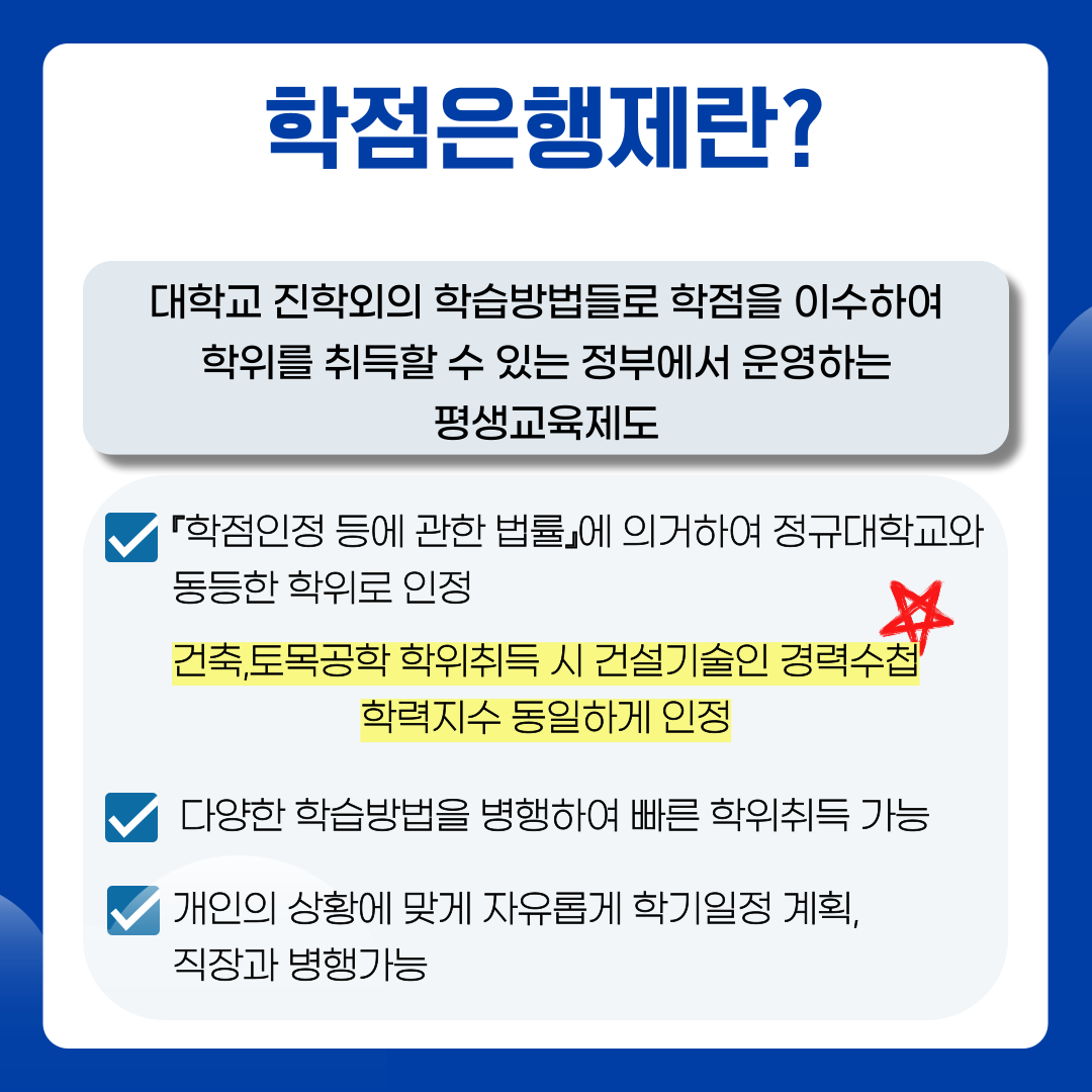 학점은행제는 정규 대학교 진학 외에도 다양한 방법으로 학점을 이수하여 학위를 취득할 수 있는 평생교육 제도입니다. 이 제도를 통해 건설 기술인 경력 수첩에서 인정받을 수 있는 학력지수를 채울 수 있습니다.