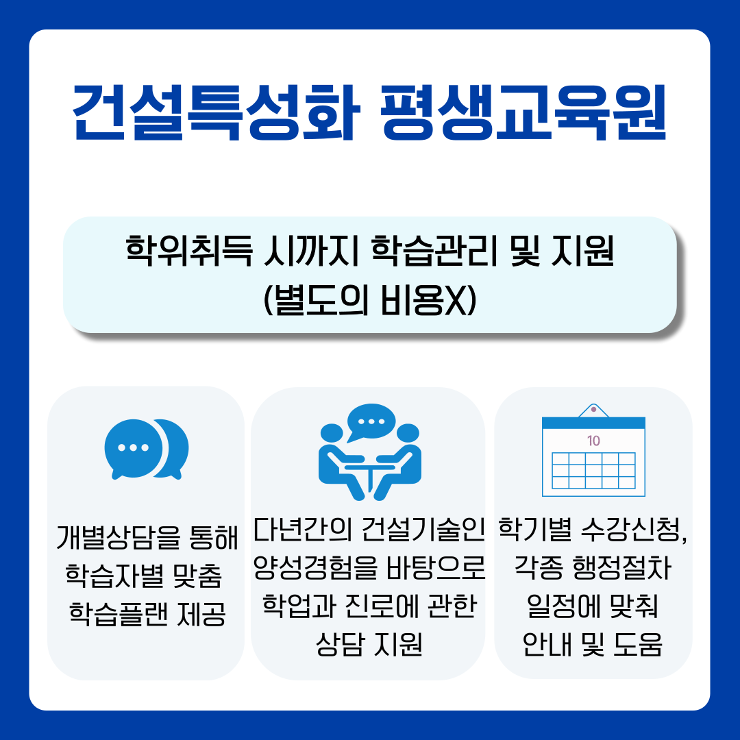 한양건축평생교육원에서는 1:1 맞춤형 커리큘럼을 제공하고, 학위 취득에 필요한 행정 지원과 학업 상담을 통해 학습을 돕습니다. 또한 취업 지원도 제공되어, 교육 기간 동안 더욱 효율적으로 학위와 자격증을 취득할 수 있습니다.