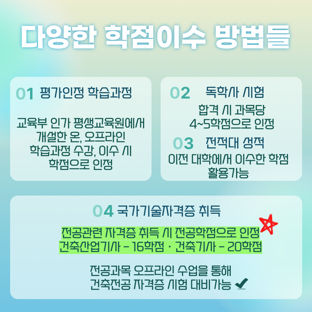 건축 관련 학점 이수 방법은 다양합니다. 예를 들어, 평가 인정 학습과정, 국가 기술 자격증 취득, 독학사 시험, 전적대 성적 등을 통해 학점으로 인정받을 수 있습니다. 이를 통해 저렴한 교육 비용과 짧은 기간 안에 건축기사 자격증과 건축공학사 학위를 취득할 수 있습니다.