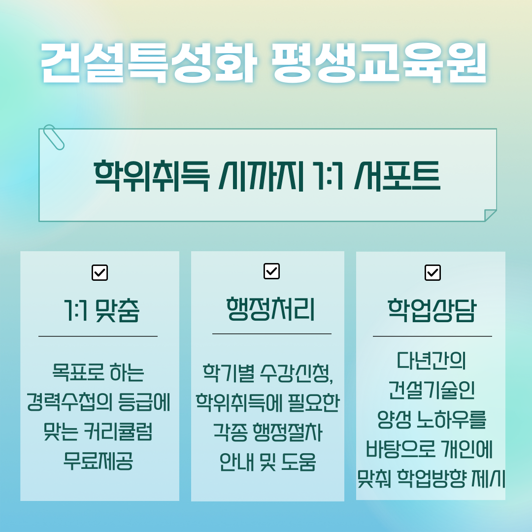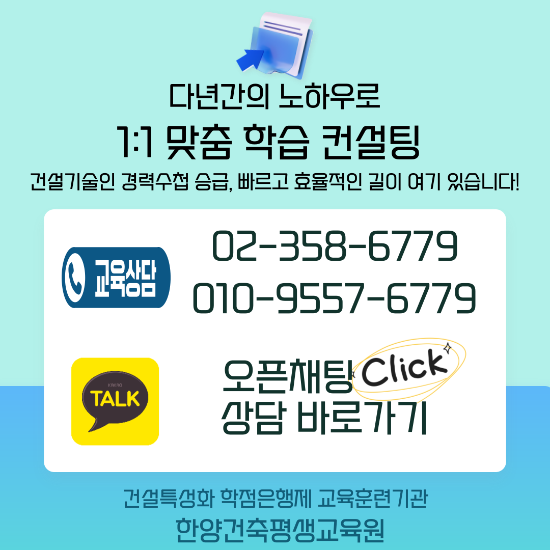 한양건축평생교육원은 1:1 맞춤 커리큘럼을 제공하며, 건축 학위 취득에 필요한 행정 처리 지원, 학업상담, 취업지원 등을 통해 학위 취득부터 취업까지 전 과정에 걸쳐 지원을 아끼지 않습니다. 저렴한 교육 비용과 짧은 교육 기간을 통해 건축기사 자격증과 건축학사 학위를 취득하여, 빠르게 중급 건설기술자 경력 수첩을 발급받을 수 있습니다.