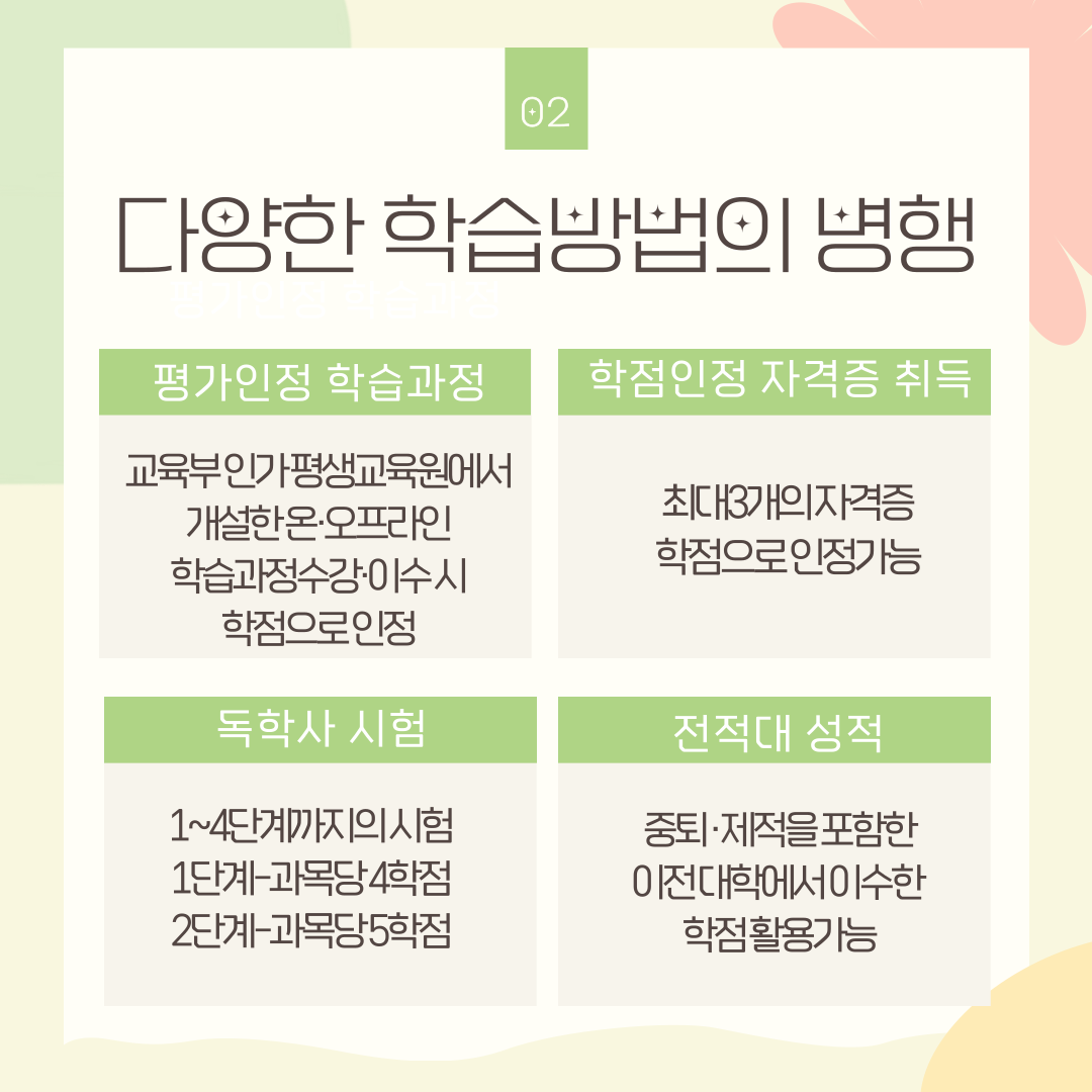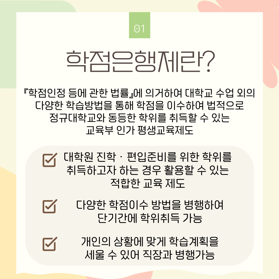 학점은행제는 **「학점인정 등에 관한 법률」**에 의거하여, 대학교 수업 외의 다양한 학습 방법으로 학점을 이수해 정규 학위를 취득할 수 있는 제도입니다. 이를 통해 고등학교 졸업 이상의 학력만 있으면 누구나 학위를 취득할 수 있으며, 학년제가 아닌 학점제로 운영되기 때문에 자신의 학습 속도와 스케줄에 맞춰 학위를 취득할 수 있습니다.