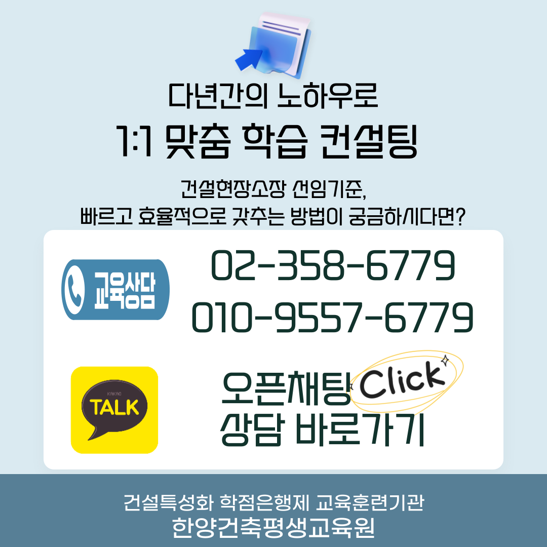 한양건축평생교육원에서 제공하는 맞춤형 교육과정을 통해, 빠르고 쉽게 건설 기술인 경력 수첩을 확보하고, 건설 업계에서 원하는 인재로 성장해 보세요!