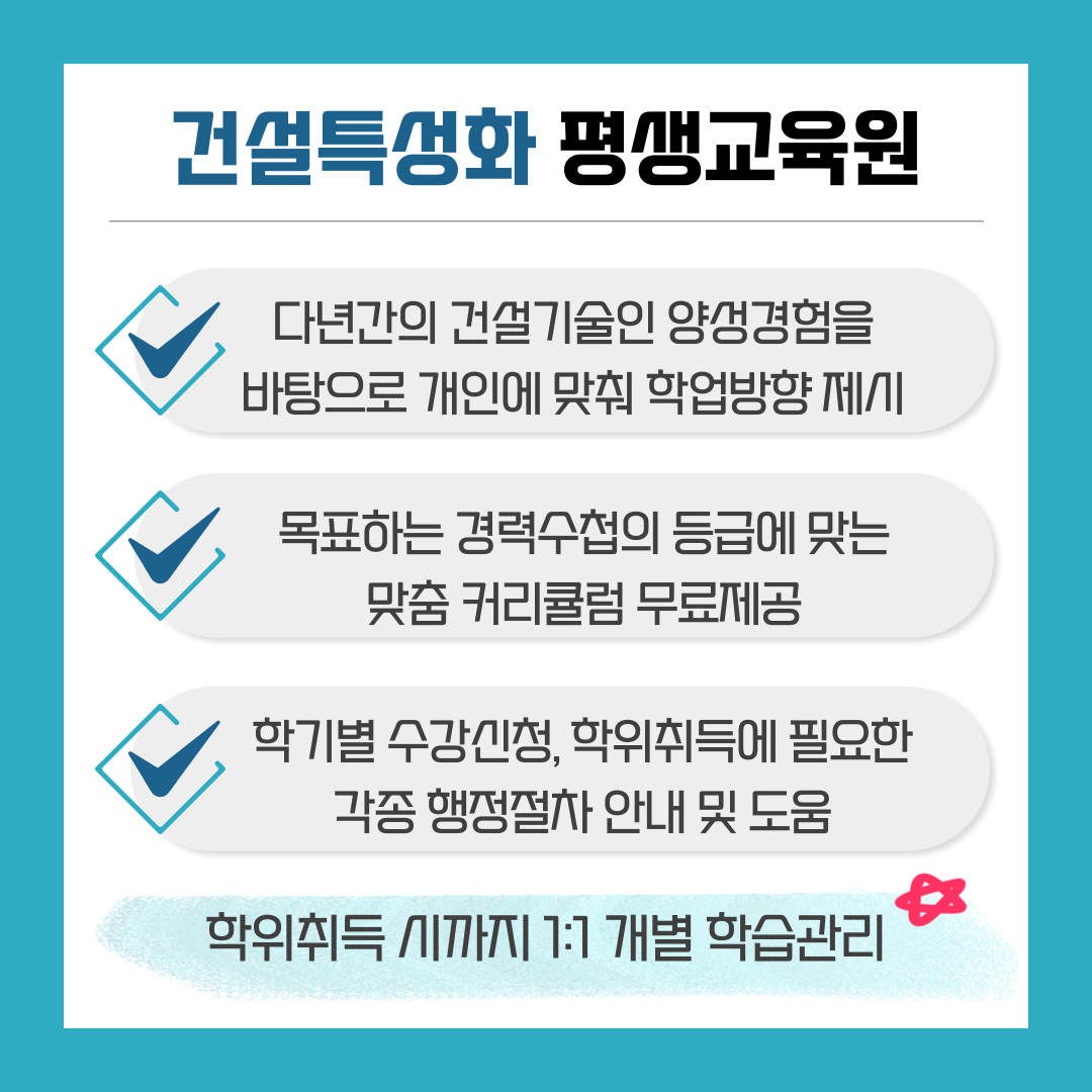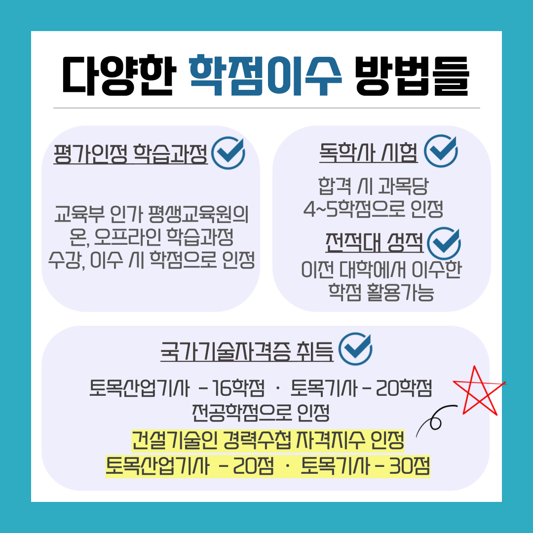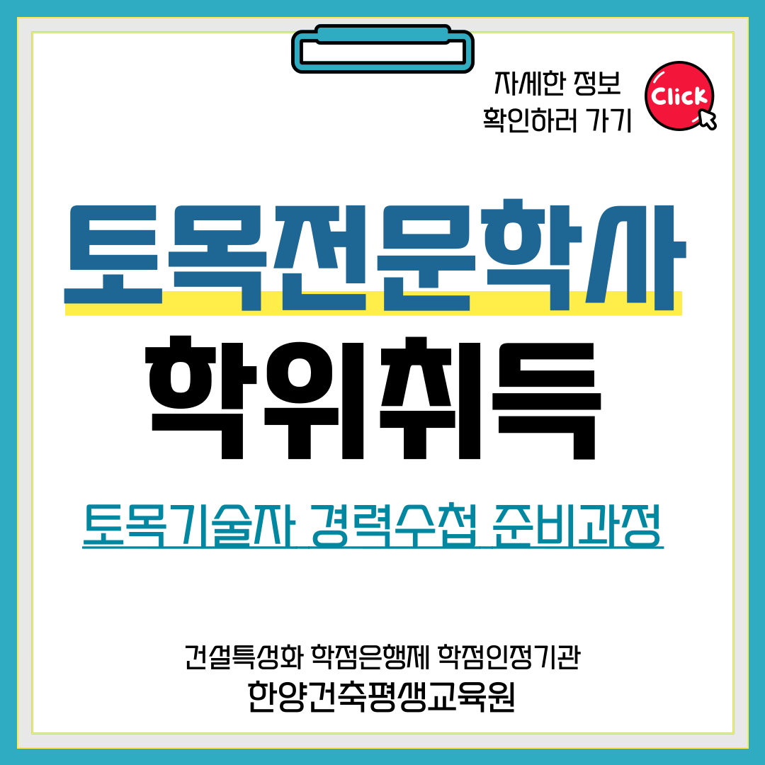 학점은행제는 대학교 진학 외의 방법으로 학점을 이수해 학위를 취득할 수 있는 정부 운영 평생교육 제도로, 토목공학사 학위를 취득하면 기술자 경력 수첩에서 중요한 학력지수를 인정받을 수 있습니다. 이 과정에서 토목기사 자격증을 취득하면, 역량지수를 최대 50점까지 인정받을 수 있어 토목 중급 건설 기술인 자격을 빠르게 갖출 수 있습니다.