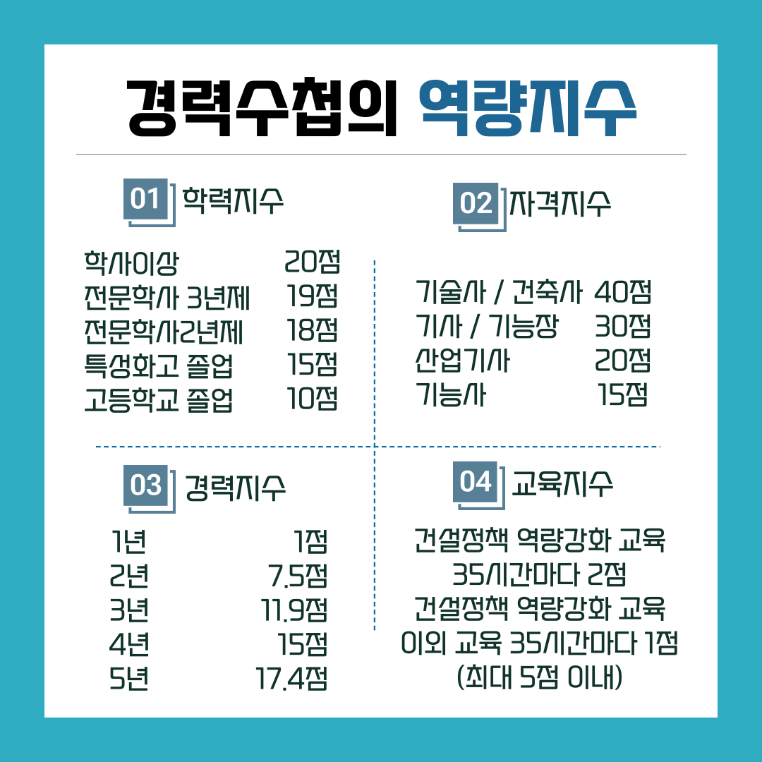 경력 수첩의 역량지수 채우기 경력 수첩의 역량지수는 학력지수, 자격 지수, 경력 지수, 건설정책 역량 강화 교육 등을 통해 채울 수 있습니다. 특히, 학점은행제를 통해 토목공학 학위를 취득하면 경력 수첩의 학력지수도 대학교 졸업자와 동일하게 인정받을 수 있어 유리합니다.
