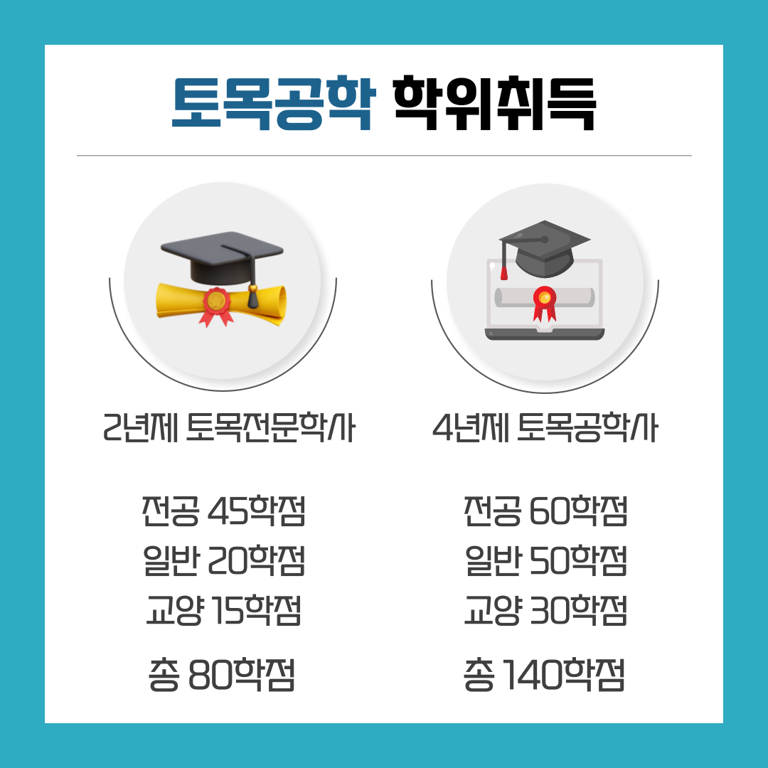 • 2년제 토목 전문 학사 : 총 80학점 (전공 45학점, 교양 15학점, 일반선택 20학점)