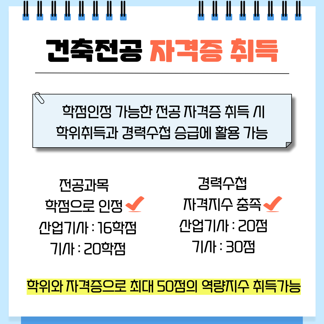 건축공학 전공 자격증을 취득하면, 해당 자격증에 따른 학점(건축산업기사 16학점, 건축기사 20학점)을 인정받을 수 있어 학위 취득 기간을 단축할 수 있습니다. 또한, 자격증 지수(건축산업기사 20점, 건축기사 30점)를 통해 중급 건설 기술인 경력 수첩을 발급받을 수 있습니다.