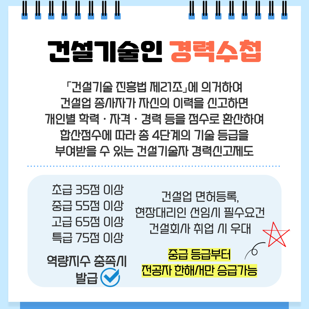 「건설 기술 진흥법 제21조」에 따라, 건설업 종사자는 자신의 학력, 자격, 근무경력 등을 한국건설기술인협회에 신고하면 이를 점수로 환산하여 건설 기술자 경력 수첩을 발급받을 수 있습니다. 이 경력 수첩은 총 4단계(초급, 중급, 고급, 특급)로 분류되며, 역량지수를 충족하면 승급이 가능합니다.