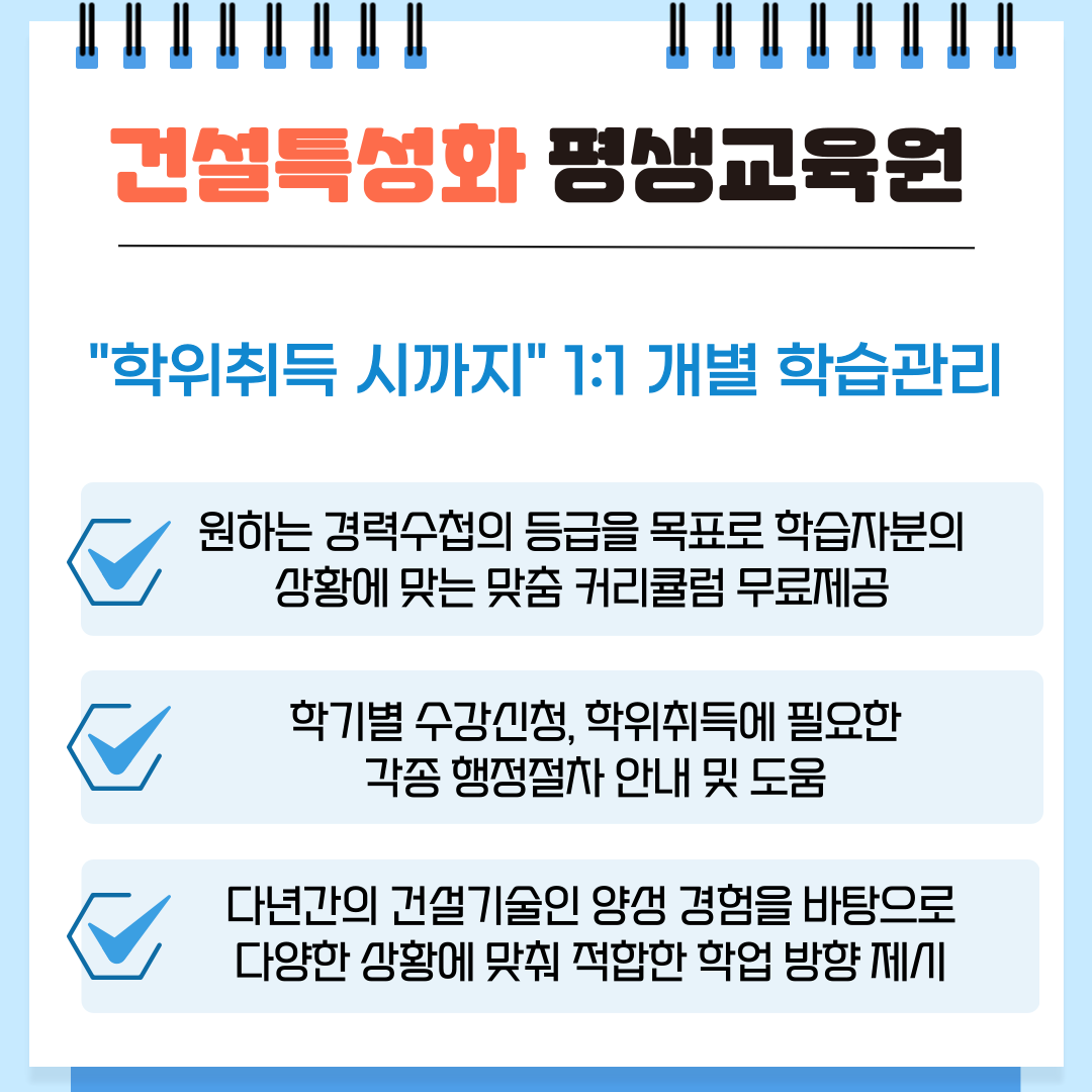 한양건축평생교육원은 다년간의 건설 기술인 양성 경험을 바탕으로, 개인 맞춤 학업 방향을 제시하며, 목표하는 경력 수첩 등급에 맞는 커리큘럼을 제공합니다. 학기별 수강신청, 학위 취득을 위한 해정 절차 안내, 취업지원 등 학위 취득까지 1:1 개별 학습 관리가 이루어집니다. 저렴한 교육 비용과 짧은 교육 기간 안에 건축학사 학위 및 건축기사 자격증을 취득해 빠르게 건설 기술인 경력 수첩을 발급받을 수 있습니다.